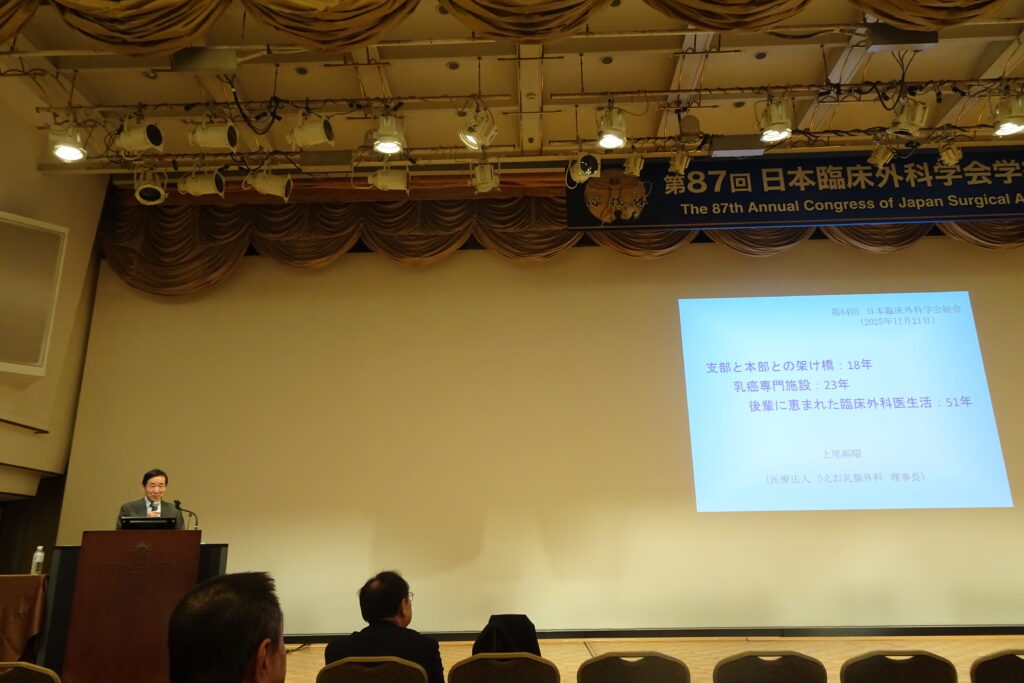 2025.11.25 上尾裕昭名誉会長 学会賞受賞 上尾裕昭名誉会長が長年の本部、支部での功績が評価され、第87回日本臨床外科学会にて学会賞を受賞され、 11月21日(金)に学会賞受賞記念講演として「支部と本部の架け橋:18年、乳癌専門施設:23年、後輩に恵まれた臨床外科医生活:51年」 のご講演を行われました。 第259回例会前の記事