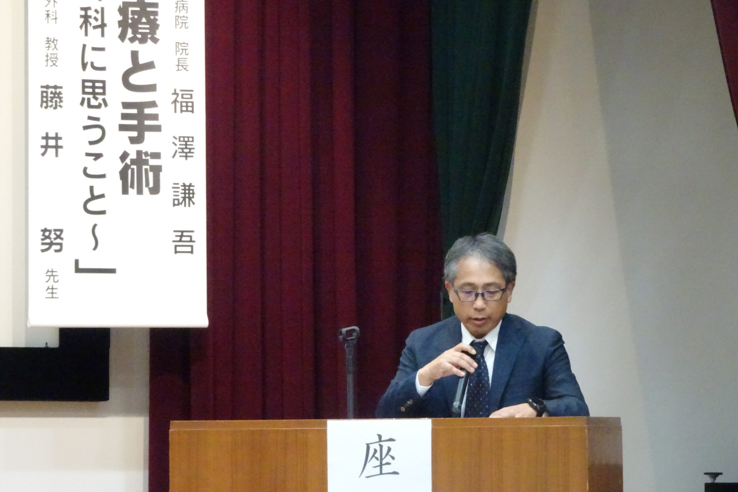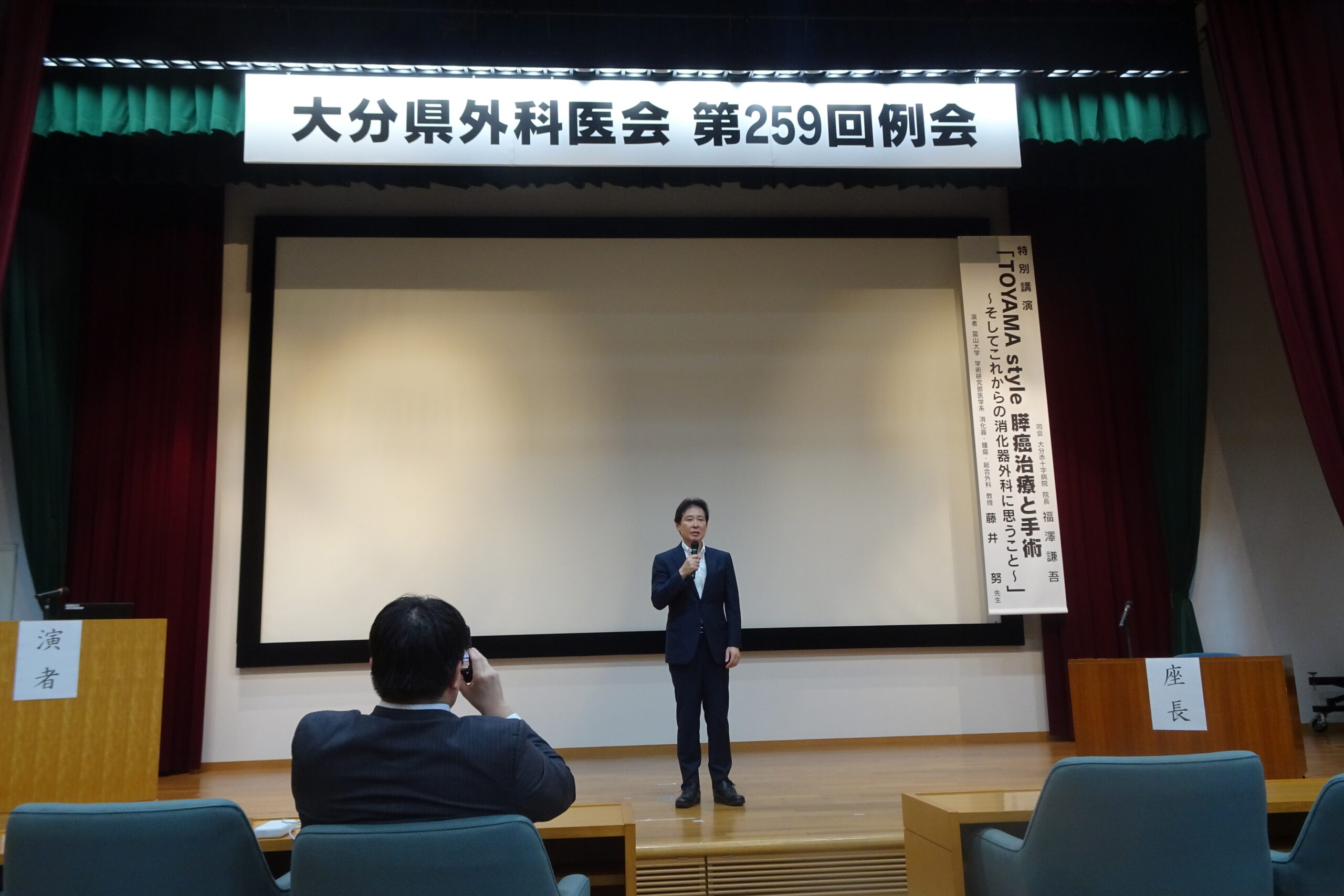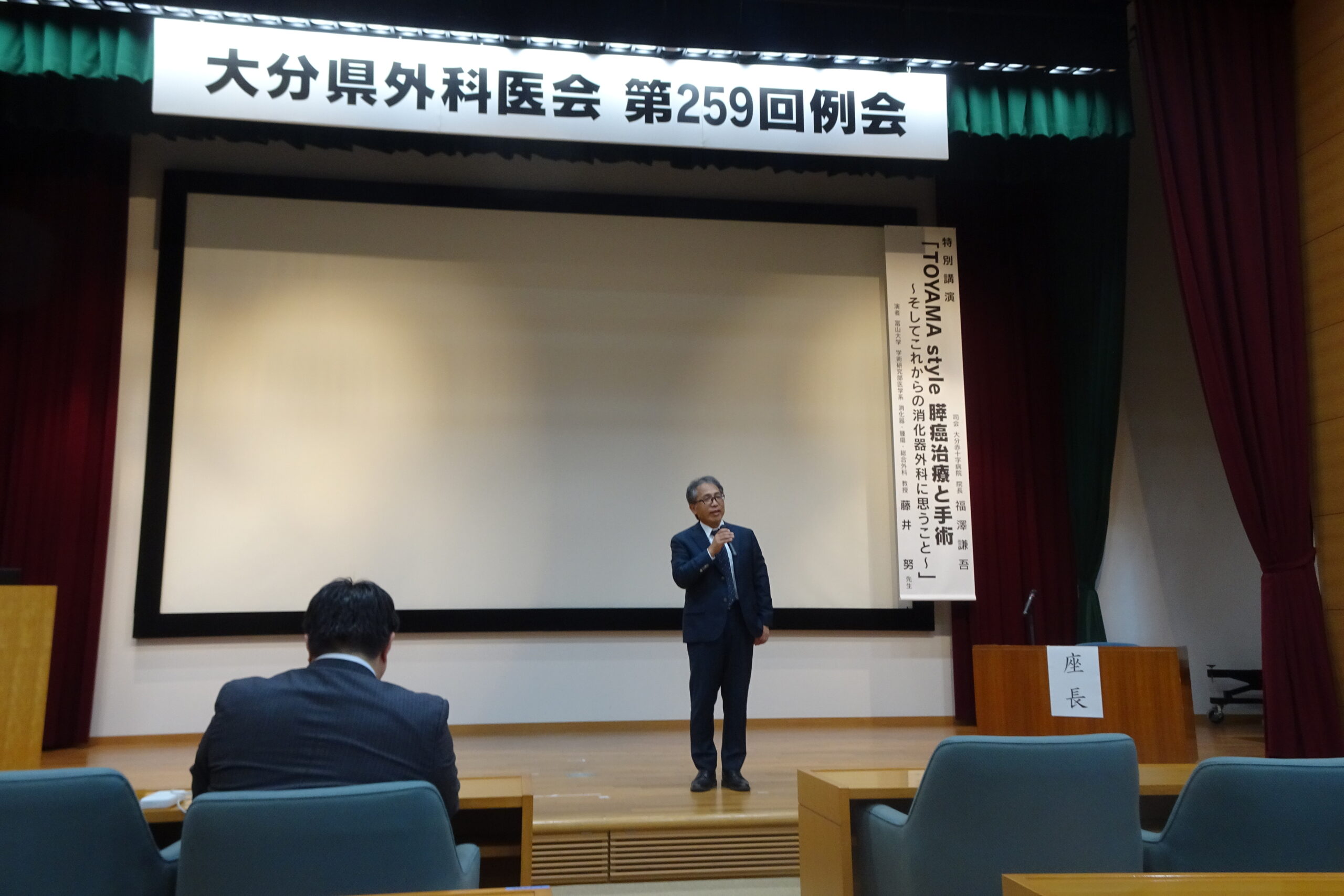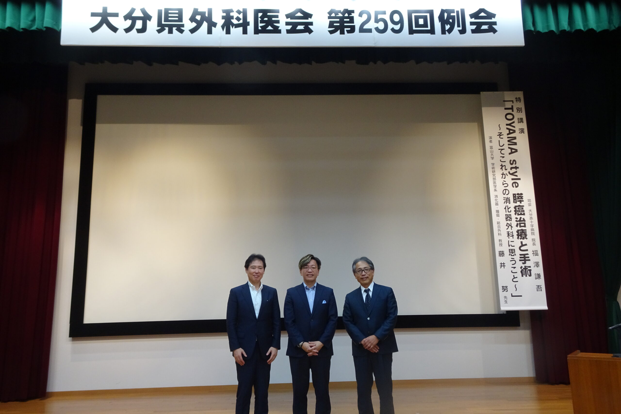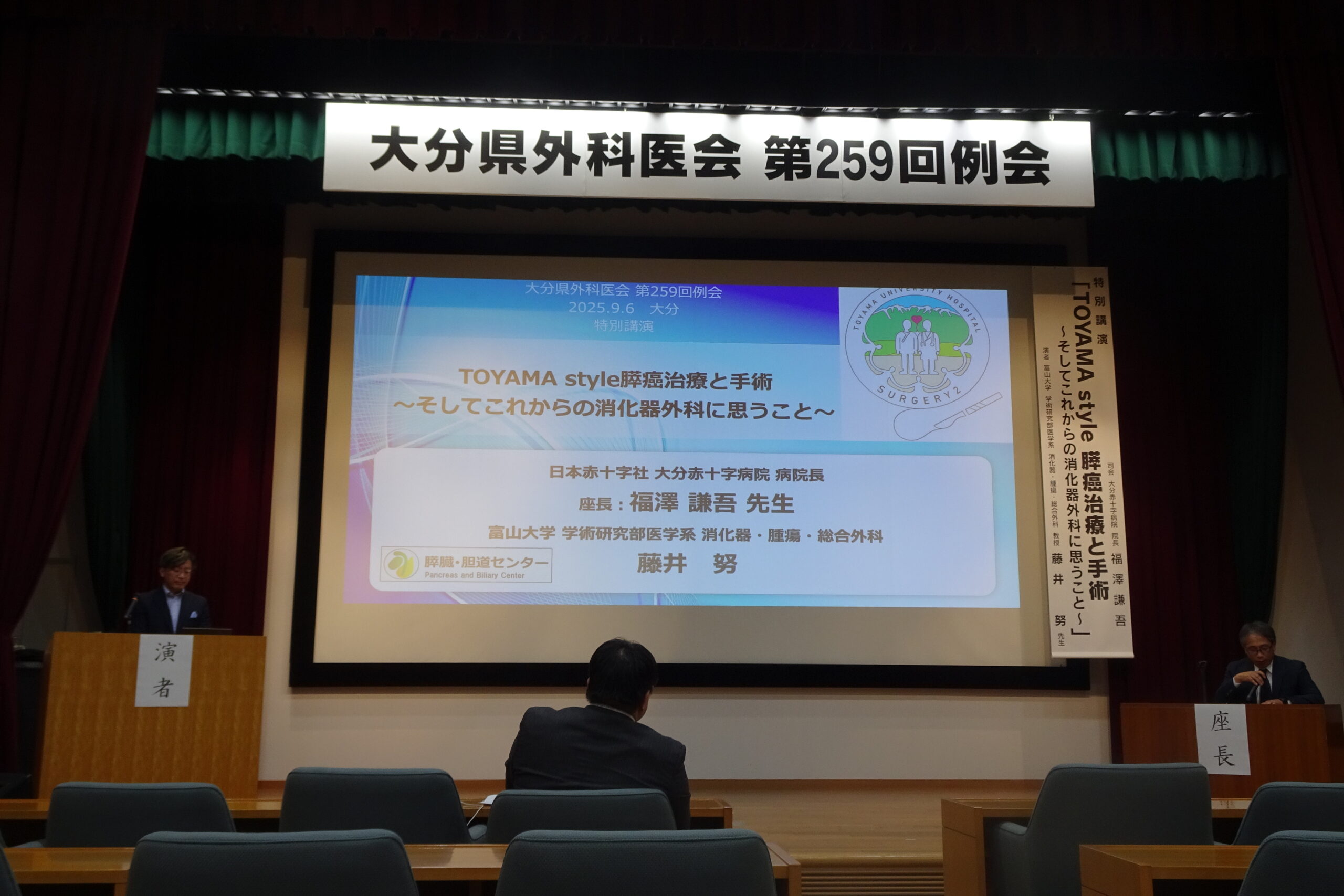2025.09.8 第259回例会 2026年9月6日(土)、第259回例会を開催しました。14題の一般演題の後、若手外科医へのワンポイントレクチャーは、 新別府病院の田島 正晃 先生による、「学会発表のいろは」のご講演でした。 また特別講演は、当番世話人の福澤 謙吾 副会長の司会のもと、富山大学 藤井 努 教授による 「TOYAMA style 膵癌治療と手術~そしてこれからの消化器外科に思うこと~」のご講演をいただきました。 第258回例会前の記事 上尾裕昭名誉会長 学会賞受賞次の記事
